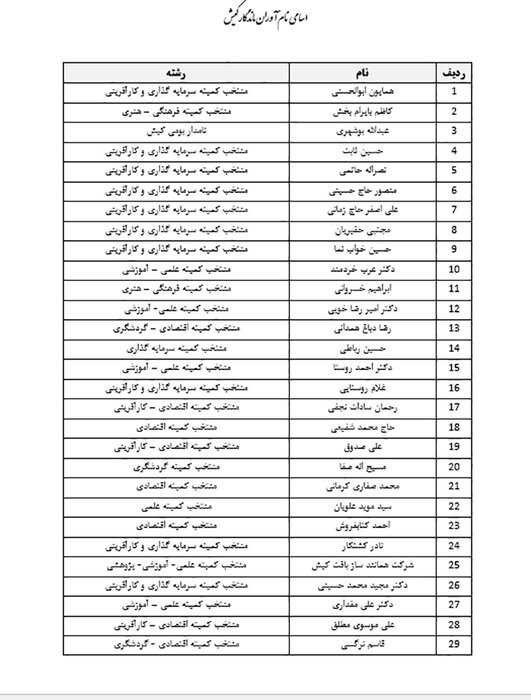 اسامی منتخب نام آوران ماندگار کیش در نخستین جشنواره به شرح ذیل است: