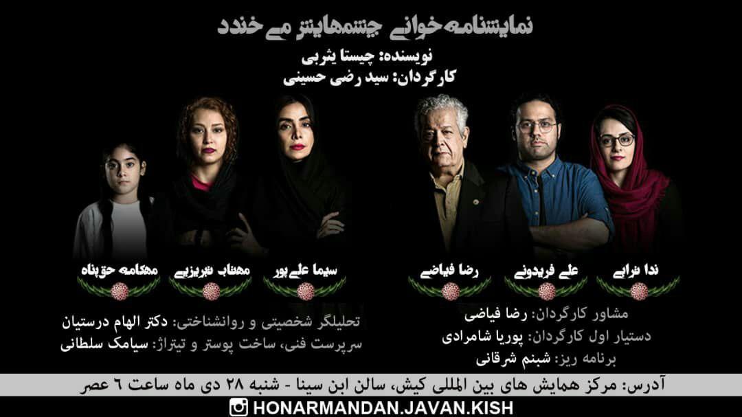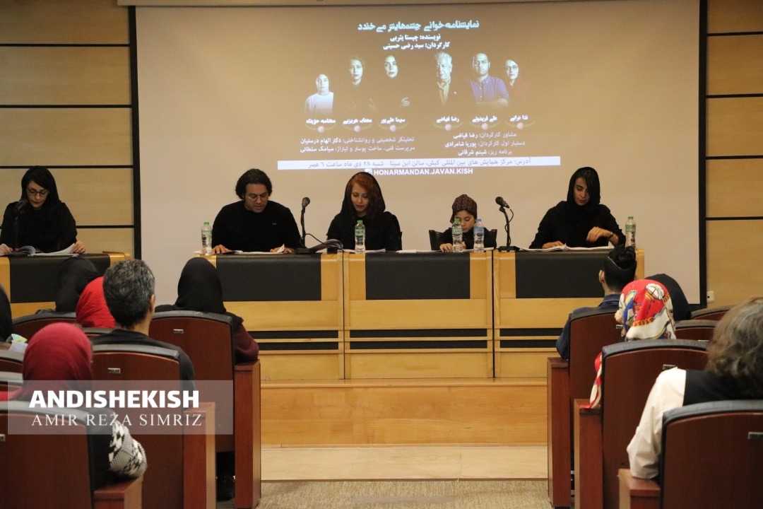 گزارش تصویری : نمایشنامه خوانی چشمهایش می خندد / نویسنده : چیستا یثربی/عکس : امیررضا سیم ریز تاریخ انتشار : 01 بهمن 1398 ارسال شده توسط:نسرین فائق موضوع :اخبارکیش , به روایت تصویر , عکس , فرهنگی , هنری 2217 بازدید