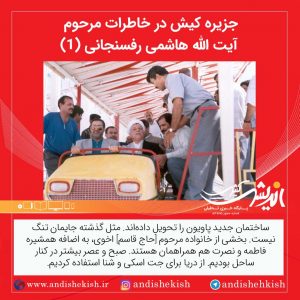 آقایان [محمدرضا] یزدان پناه، [مدیرعامل سازمان منطقه آزاد کیش]، [مرتضی] الویری، [رییس شورای عالی مناطق آزاد]، [حسین] محلوجی، [وزیر معادن و فلزات] و… در فرودگاه کیش به استقبال آمده بودند. آقای یزدان پناه، در راه تا پاویون، گزارش وضع کیش را داد. هوا خوب است. باران کم آمده و مثل گذشته سرسبز نیست. مسافر زیاد است. تور گردشگری از ترکمنستان دارند؛ مکان مخصوصی برای شنای آنان در نظر گرفتهاند که بیشتر خارجیها استقبال کردهاند.