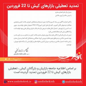 بر اساس اطلاعیه جامعه بازاریان و بازرگانان کیش ، تعطیلی بازارهای کیش تا ۲۲ فروردین تمدید گردیده است