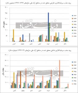 بررسیها در یک گزارش پژوهشی در فاصله سالهای ۹۹-۱۳۹۲ نشان میدهد که مناطق آزاد ایران در چهار شاخص اصلی سرمایهگذاری داخلی و خارجی، تولید و صادرات نسبت به سایر مناطق آزاد جهان و حتی سرزمین اصلی عملکرد ضعیف و غیرقابلقبولی داشتهاند.