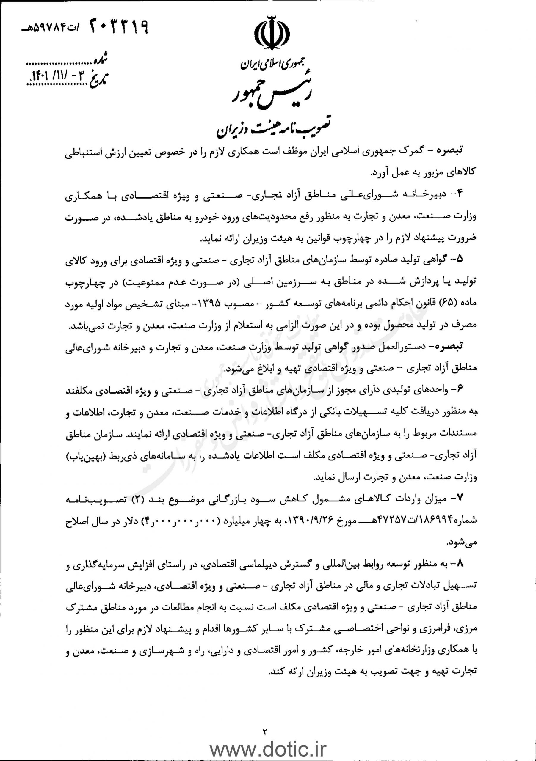 هیئت وزیران در جلسه ۱۴۰۱/۱۰/۲۵ به پیشنهاد شماره ۷۹۱۷ مورخ ۱۴۰۱/۱/۲۲ معاونت اقتصادی رییس جمهور و به استناد اصل یکصد و سی و هشتم قانون اساسی جمهوری اسلامی ایران تصویب کرد: