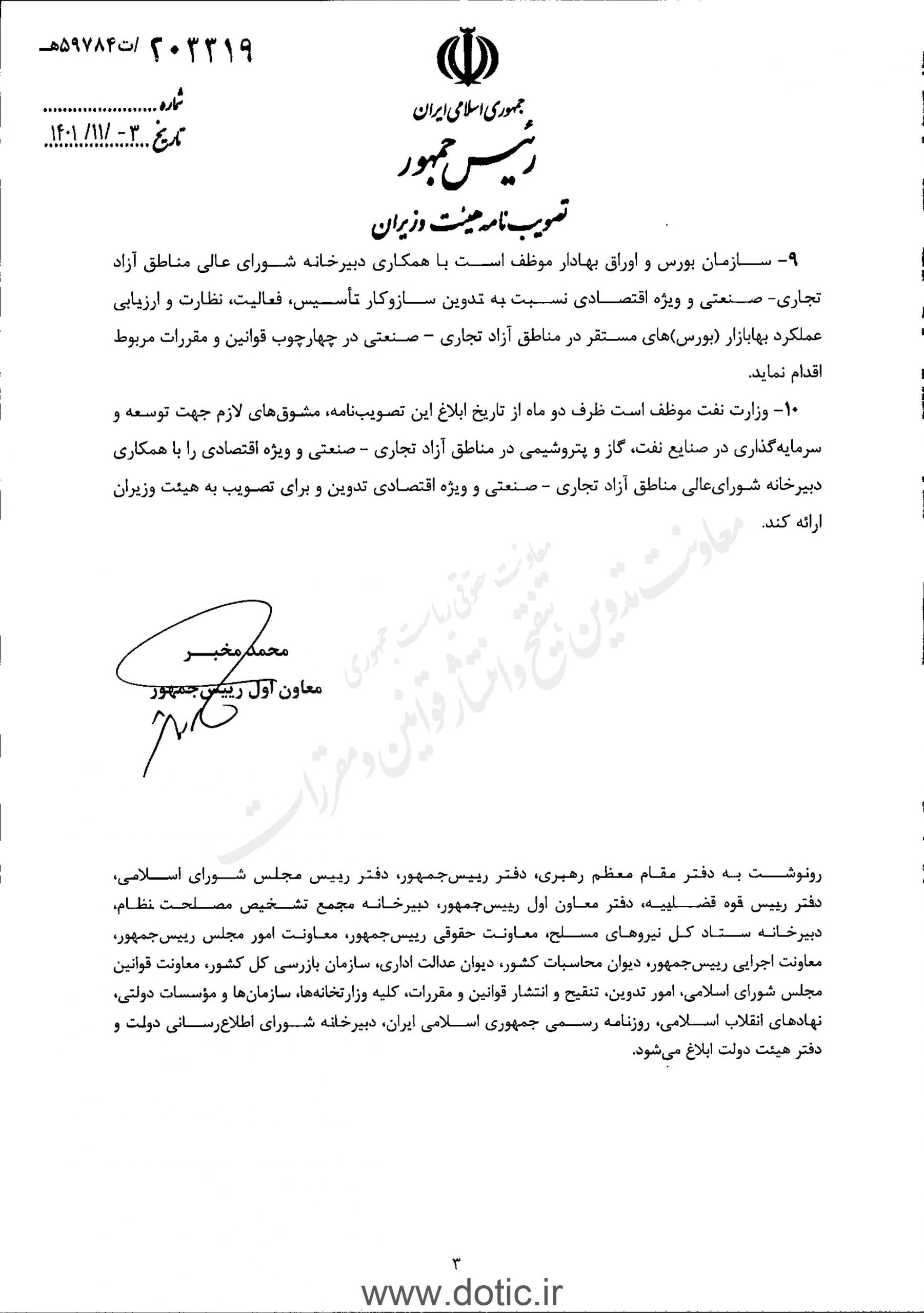 ۱۰- وزارت نفت موظف است ظرف دو ماه از تاریخ ابلاغ این تصویب نامه مشوق های لازم جهت توسعه و سرمایه گذاری در صنایع نفت، گاز و پتروشیمی در مناطق آزاد تجاری – صنعتی و ویژه اقتصادی را با همکاری دبیرخانه شورای عالی مناطق آزاد تجاری – صنعتی و ویژه اقتصادی تدوین و برای تصویب به هیئت وزیران ارائه کند.