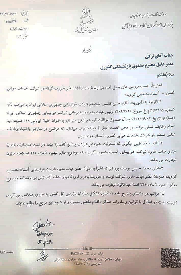 پس از این انتصابات، روز ۲۱ شهریور امسال، اشکان میرمحمدی، بازرس کل تعاون، کار و رفاه اجتماعی سازمان بازرسی کل کشور در نامهای به نعمتالله ترکی، مدیرعامل وقت صندوق بازنشستگی کشوری، اعلام کرد که ۳ انتصاب اخیر در هیأت مدیره شرکت هواپیمایی آسمان مغایر با قانون تشخیص داده شده است.