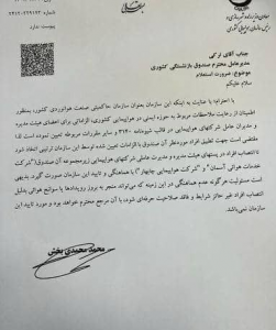پس از این نامه بود که محمد محمدیبخش، در نامهای به مدیرعامل وقت صندوق بازنشستگی کشوری (نعمتالله ترکی) با تأکید بر ضرورت استعلام در انتصابهای شرکتهای هواپیمایی زیر مجموعه صندوق بازنشستگی کشوری نوشته بود: با عنایت به اینکه سازمان هواپیمایی کشوری به عنوان سازمان حاکمیتی صنعت هوانوردی کشور به منظور اطمینان از رعایت ملاحظات مربوط به حوزه ایمنی در هواپیمایی کشوری الزاماتی برای اعضای هیأت مدیره و مدیران عامل شرکتهای هواپیمایی در قالب شیوهنامه ۳۱۴۰ و سایر مقررات مربوطه تعیین کرده است، بنابراین مقتضی است جهت تطبیق افراد مورد نظر آن صندوق با الزامات تعیین شده توسط این سازمان ترتیبی اتخاذ شود تا انتصابات افراد در پستهای هیأت مدیره و مدیرعاملی شرکتهای هواپیمایی زیرمجموعه آن صندوق شامل؛ شرکت خدمات هوایی آسمان و شرکت هواپیمایی چابهار با هماهنگی و تأیید این سازمان صورت گیرد.