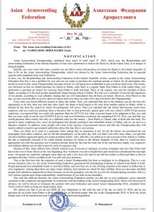 در بخشهایی از نامه کنفدراسیون مچ اندازی آسیا به عبدالمهدی نصیرزاده رئیس فدراسیون بدنسازی ایران آمده است: کنفدراسیون مچ اندازی آسیا به اطلاع رئیس فدراسیون بدنسازی ایران میرساند که به دلیل سهل انگاری، تخلفات فاحش و مکرر شما از شرایط و توافقات مربوط به برگزاری مسابقات قهرمانی آسیا ۲۰۲۴ که از قبل مطرح شده بود، مجبور به فسخ قرارداد میزبانی مسابقات میشویم. در صورتی که تا پایان ساعت اداری ۲۲ آوریل ۲۰۲۴ ( امروز جمعه) تعهدات خود را به طور کامل انجام ندهید و تمام بلیتهای هواپیما از دبی به کیش و برگشت را برای ورزشکاران خارجی خریداری نکنید، مسابقات قهرمانی آسیا ۲۰۲۴ در کیش لغو و فدراسیون ایران جریمه و محروم خواهد شد.