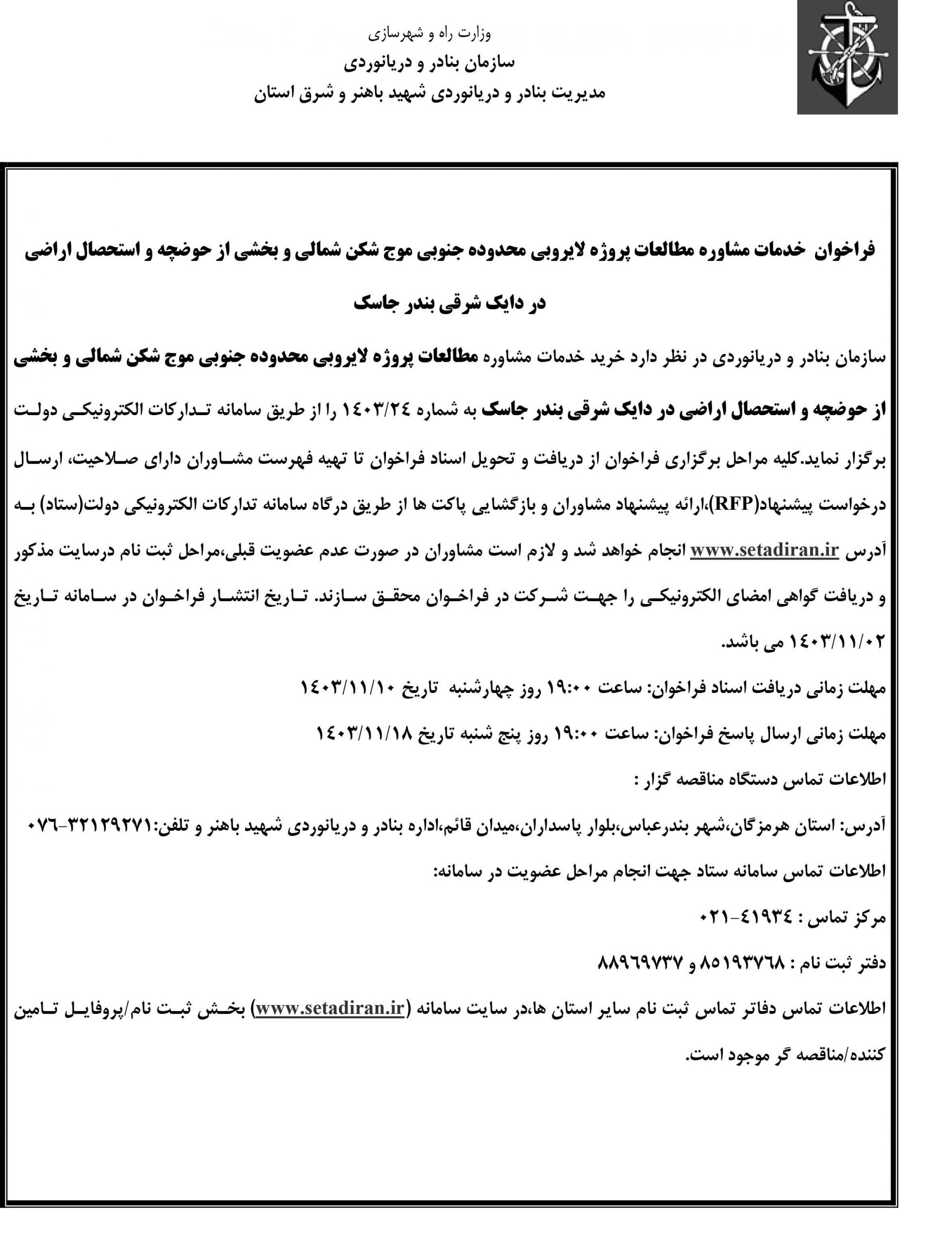 سازمان بنادر و دریانوردی در نظر دارد خرید خدمات مشاوره مطالعات پروژه لایروبی محدوده جنوبی موج شکن شمالی و بخشی از حوضچه و استحصال اراضی در دایک شرقی بندر جاسک به شماره ۲۴/۱۴۰۳ را از طریق سامانه تدارکات الکترونیکی دولت برگزار نماید.کلیه مراحل برگزاری فراخوان از دریافت و تحویل اسناد فراخوان تا تهیه فهرست مشاوران دارای صلاحیت، ارسال درخواست پیشنهاد(RFP)،ارائه پیشنهاد مشاوران و بازگشایی پاکت ها از طریق درگاه سامانه تدارکات الکترونیکی دولت(ستاد) به آدرس www.setadiran.ir انجام خواهد شد و لازم است مشاوران در صورت عدم عضویت قبلی،مراحل ثبت نام درسایت مذکور و دریافت گواهی امضای الکترونیکی را جهت شرکت در فراخوان محقق سازند. تاریخ انتشار فراخوان در سامانه تاریخ ۰۲/۱۱/۱۴۰۳ می باشد.