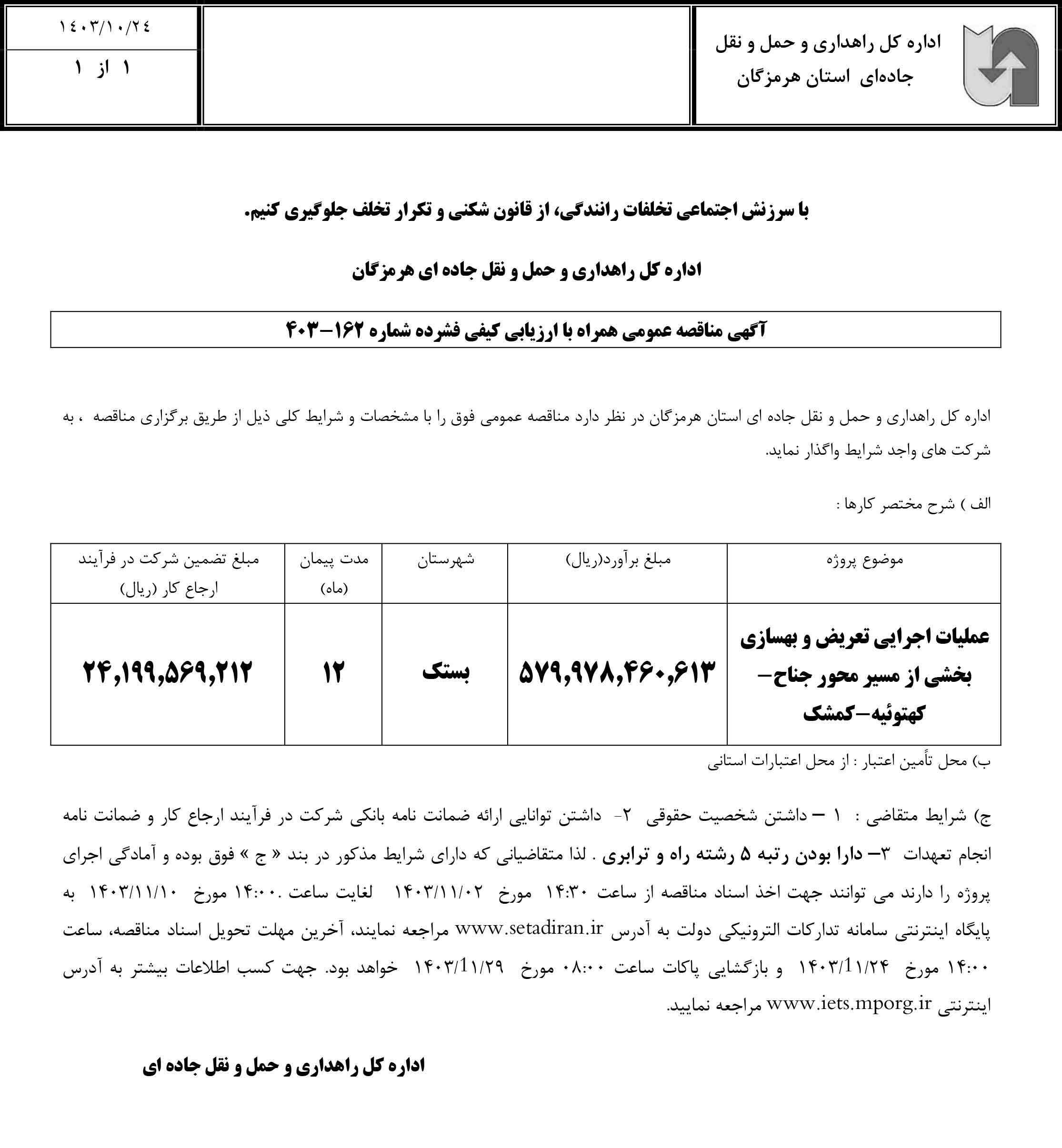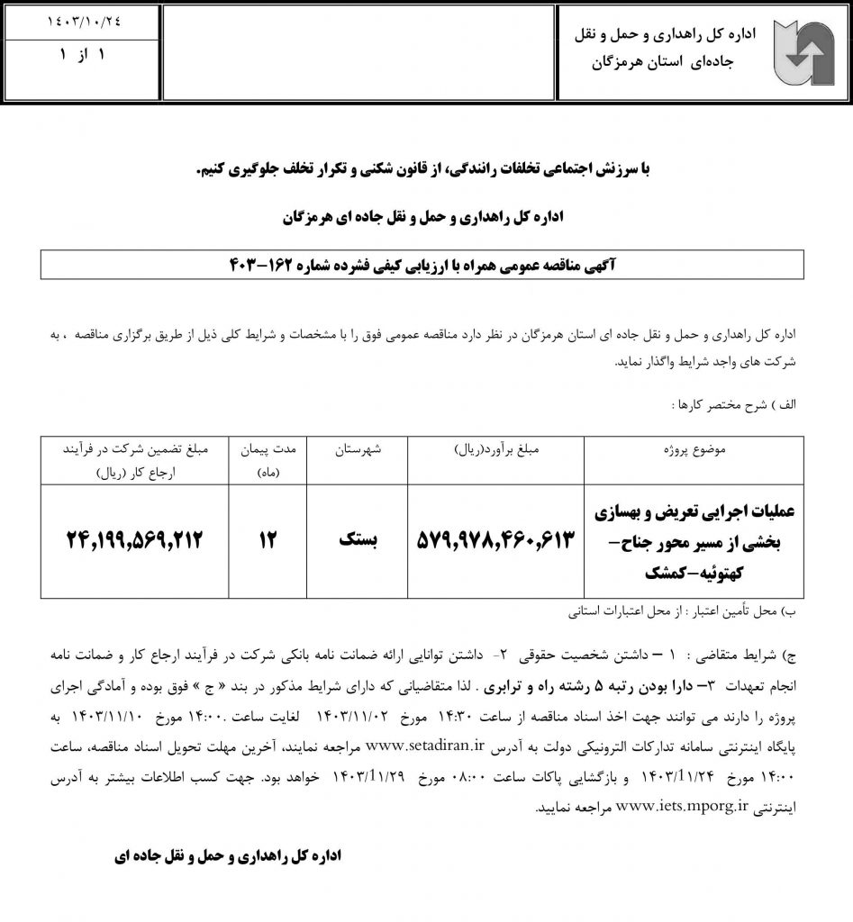ج) شرایط متقاضی : ۱ – داشتن شخصیت حقوقی ۲- داشتن توانایی ارائه ضمانت نامه بانکی شرکت در فرآیند ارجاع کار و ضمانت نامه انجام تعهدات ۳– دارا بودن رتبه ۵ رشته راه و ترابری . لذا متقاضیانی که دارای شرایط مذکور در بند « ج » فوق بوده و آمادگی اجرای پروژه را دارند می توانند جهت اخذ اسناد مناقصه از ساعت ۱۴:۳۰ مورخ ۰۲/۱۱/۱۴۰۳ لغایت ساعت .۱۴:۰۰ مورخ ۱۰/۱۱/۱۴۰۳ به پایگاه اینترنتی سامانه تدارکات الترونیکی دولت به آدرس www.setadiran.ir مراجعه نمایند، آخرین مهلت تحویل اسناد مناقصه، ساعت ۱۴:۰۰ مورخ ۲۴/۱۱/۱۴۰۳ و بازگشایی پاکات ساعت ۰۸:۰۰ مورخ ۲۹/۱۱/۱۴۰۳ خواهد بود. جهت کسب اطلاعات بیشتر به آدرس اینترنتی www.iets.mporg.ir مراجعه نمایید.