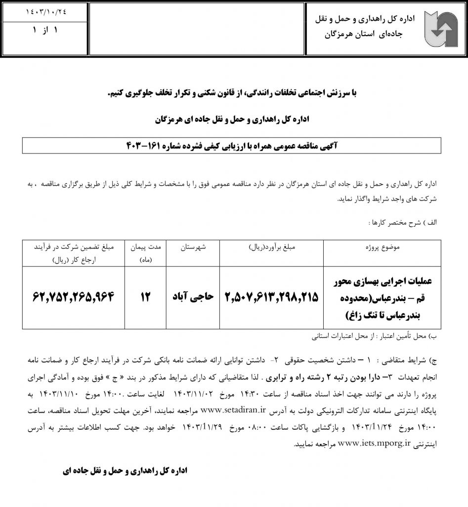 ج) شرایط متقاضی : ۱ – داشتن شخصیت حقوقی ۲- داشتن توانایی ارائه ضمانت نامه بانکی شرکت در فرآیند ارجاع کار و ضمانت نامه انجام تعهدات ۳– دارا بودن رتبه ۲ رشته راه و ترابری . لذا متقاضیانی که دارای شرایط مذکور در بند « ج » فوق بوده و آمادگی اجرای پروژه را دارند می توانند جهت اخذ اسناد مناقصه از ساعت ۱۴:۳۰ مورخ ۰۲/۱۱/۱۴۰۳ لغایت ساعت .۱۴:۰۰ مورخ ۱۰/۱۱/۱۴۰۳ به پایگاه اینترنتی سامانه تدارکات الترونیکی دولت به آدرس www.setadiran.ir مراجعه نمایند، آخرین مهلت تحویل اسناد مناقصه، ساعت ۱۴:۰۰ مورخ ۲۴/۱۱/۱۴۰۳ و بازگشایی پاکات ساعت ۰۸:۰۰ مورخ ۲۹/۱۱/۱۴۰۳ خواهد بود. جهت کسب اطلاعات بیشتر به آدرس اینترنتی www.iets.mporg.ir مراجعه نمایید.