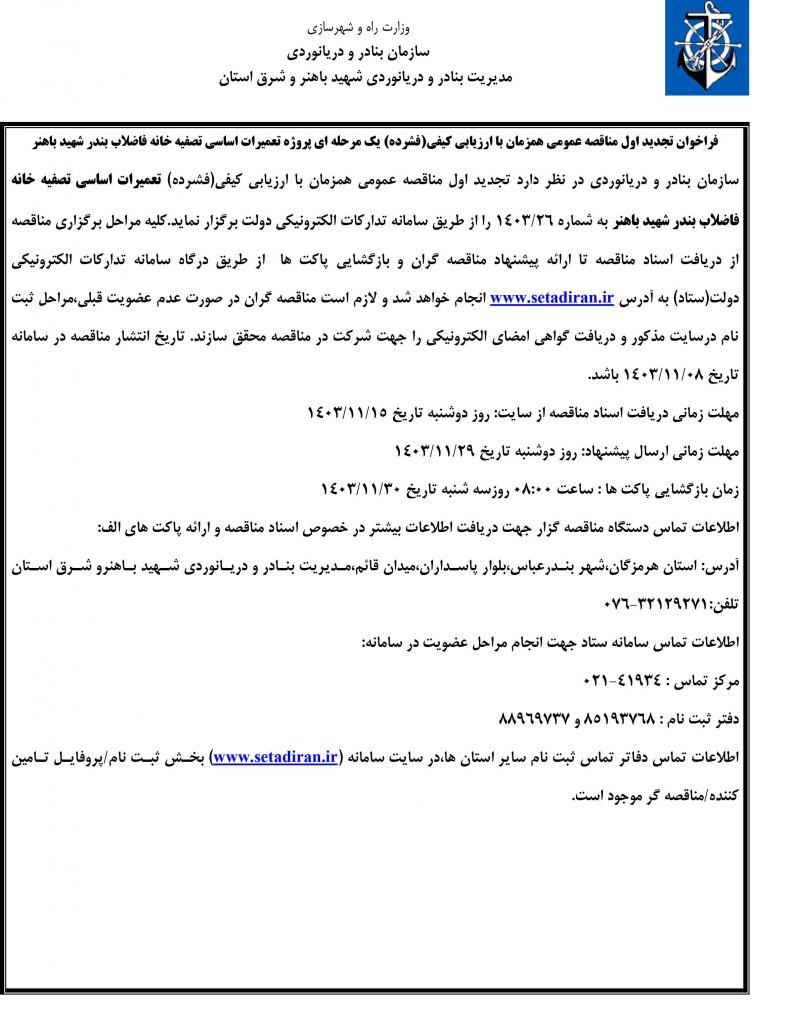 سازمان بنادر و دریانوردی در نظر دارد تجدید اول مناقصه عمومی همزمان با ارزیابی کیفی(فشرده) تعمیرات اساسی تصفیه خانه فاضلاب بندر شهید باهنر به شماره ۲۶/۱۴۰۳ را از طریق سامانه تدارکات الکترونیکی دولت برگزار نماید.کلیه مراحل برگزاری مناقصه از دریافت اسناد مناقصه تا ارائه پیشنهاد مناقصه گران و بازگشایی پاکت ها از طریق درگاه سامانه تدارکات الکترونیکی دولت(ستاد) به آدرس www.setadiran.ir انجام خواهد شد و لازم است مناقصه گران در صورت عدم عضویت قبلی،مراحل ثبت نام درسایت مذکور و دریافت گواهی امضای الکترونیکی را جهت شرکت در مناقصه محقق سازند. تاریخ انتشار مناقصه در سامانه تاریخ ۰۸/۱۱/۱۴۰۳ باشد.