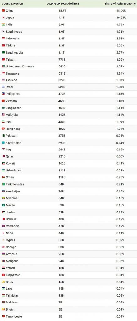 بعد از چین، ژاپن و هند، کشورهای کره جنوبی و اندونزی به ترتیب با ۱٫۹ و ۱٫۴ تریلیون دلار در رتبه های بعدی اند. این ۵ کشور ۷۴ درصد اقتصاد آسیا را دارند.