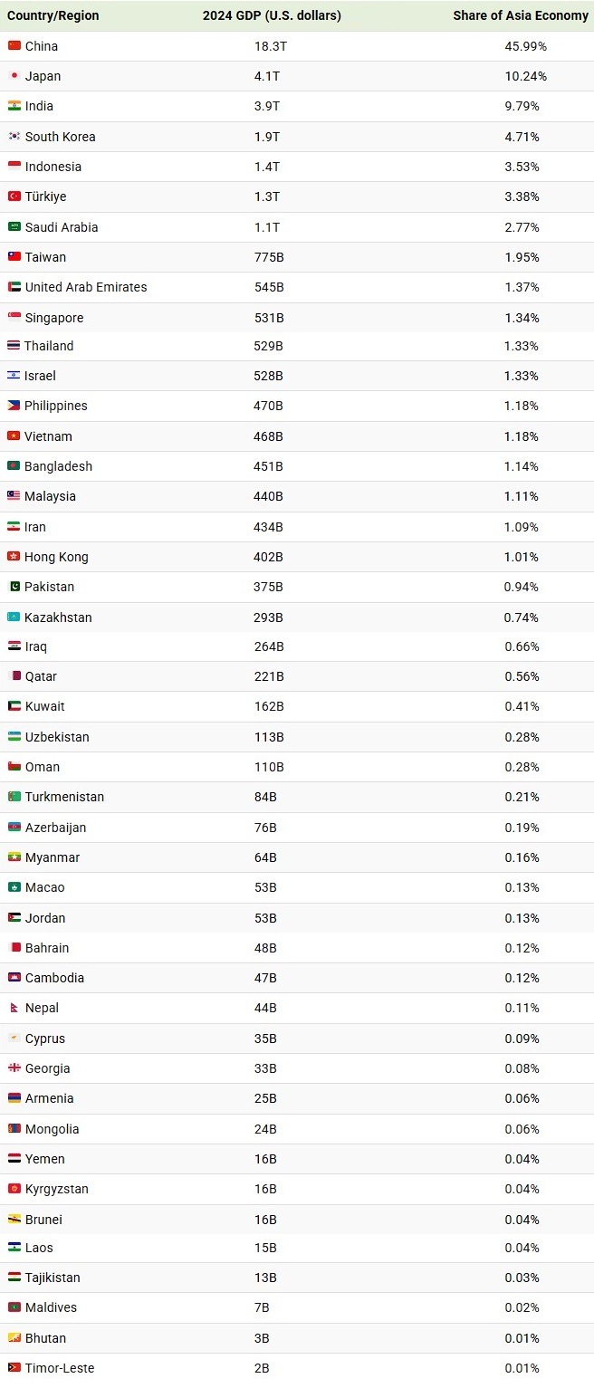 این ۱۰ کشور، مجموعاً ۸۵ درصد اقتصاد آسیا را در دست دارند.
