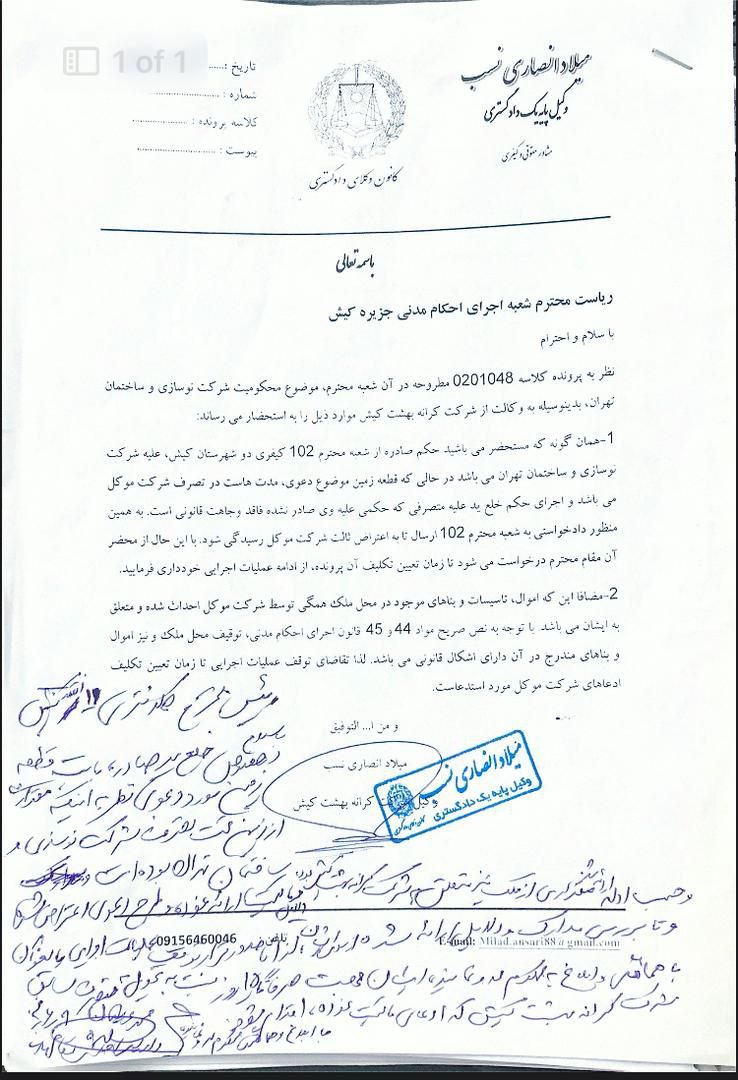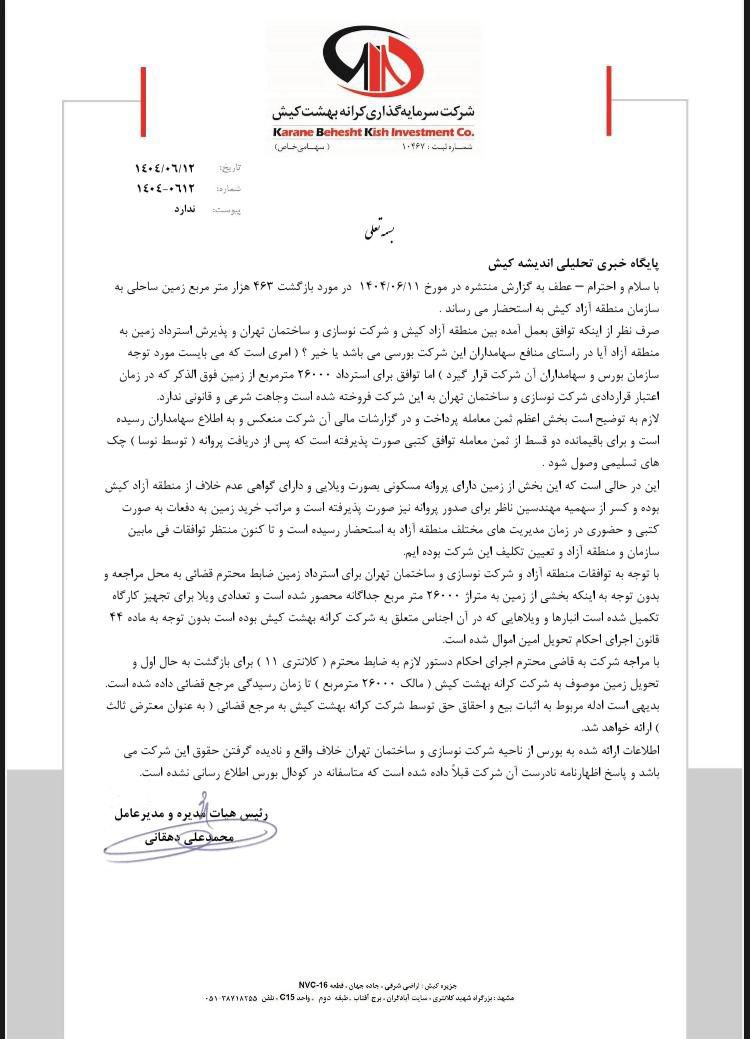 جوابیه و توضیحات شرکت سرمایه گذاری کرانه بهشت کیش درباره خبر منتشر شده با عنوان (( ۴۶۳ هزار متر مربع زمین ساحلی به سازمان منطقه آزاد کیش بازگشت))