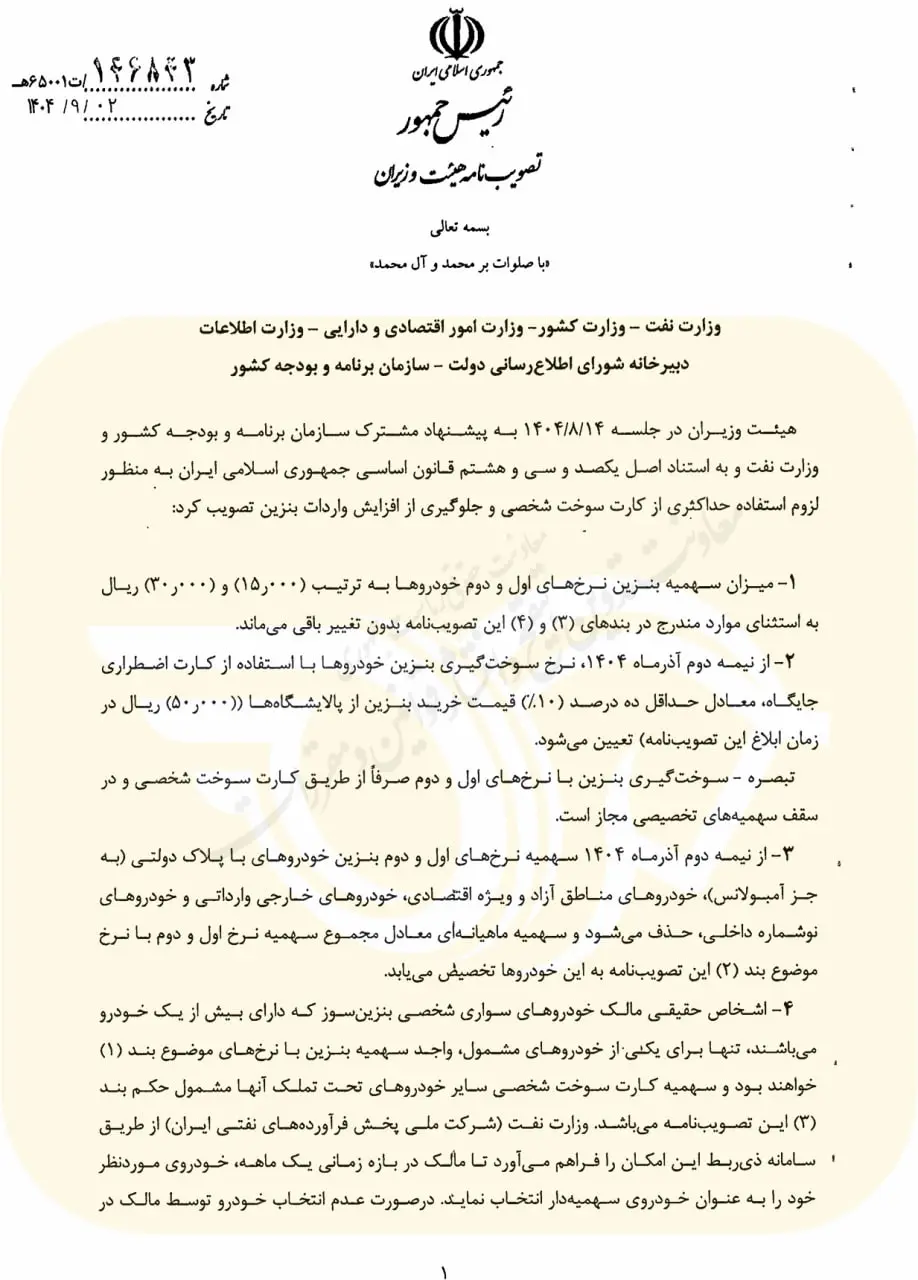 انتشار تصویبنامه هیئت وزیران به شماره ۱۴۶۸۴۳ مورخ ۲ آذر ۱۴۰۴، زلزلهای خبری در محافل اقتصادی و بهویژه بازار خودروی کشور ایجاد کرده است. این مصوبه که با امضای معاون اول رئیسجمهور ابلاغ شده، نقشه راه جدید دولت برای مدیریت مصرف سوخت و اصلاح نظام یارانهای انرژی را ترسیم میکند. برخلاف شایعات پیشین که تنها به افزایش قیمت پلکانی اشاره داشتند، سند جدید نشاندهنده یک جراحی عمیق در نحوه توزیع بنزین است که بهطور مستقیم خریداران خودروهای جدید، مالکان خودروهای وارداتی و صاحبان چند خودرو را هدف قرار داده است. طبق این ابلاغیه، از نیمه دوم آذرماه ۱۴۰۴، مفهوم «بنزین سهمیهای» برای بخش بزرگی از ناوگان جدید خودرویی کشور به تاریخ خواهد پیوست و نرخ شناور مبتنی بر فوب خلیجفارس جایگزین آن خواهد شد.