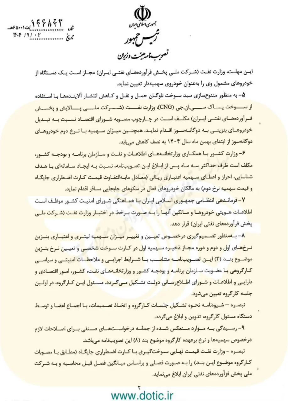 در بند دوم این مصوبه، مکانیسم قیمتگذاری جدیدی برای بنزین غیریارانهای تعریف شده است. تا پیش از این، بنزین آزاد نرخ ثابتی داشت، اما اکنون دولت فرمول «قیمت خرید بنزین از پالایشگاهها (معادل فوب خلیجفارس) به علاوه ۱۰ درصد» را مبنا قرار داده است. در متن مصوبه صراحتاً ذکر شده که در زمان ابلاغ، این نرخ معادل ۵۰,۰۰۰ ریال (۵ هزار تومان) نیست، بلکه ۵۰,۰۰۰ تومان (۵۰۰,۰۰۰ ریال) است؟ (نکته تحلیلی: در متن تصویر عدد ۵۰.۰۰۰ ریال درج شده است اما با توجه به کانتکست “حداقل معادل فوب”، احتمالا منظور ۵۰ هزار تومان است یا در متن تصویر ریال درج شده که معادل ۵ هزار تومان است. اما با توجه به اینکه نرخ دوم الان ۳۰۰۰ تومان است، نرخ ۵۰۰۰ تومان برای بنزین آزاد منطقی به نظر میرسد، اما عبارت “معادل حداقل ۹۰ درصد فوب” در مصوبات قبلی بود. در اینجا “قیمت خرید بنزین از پالایشگاهها” ذکر شده. اگر فرض بر ۵۰,۰۰۰ ریال باشد، افزایش قیمت ملایم است. اما اگر بر اساس قیمت فوب (حدود ۵۰-۶۰ سنت) محاسبه شود، عدد ۵۰,۰۰۰ تومان نزدیکتر به واقعیت فوب است. با دقت در تصویر: عدد (۵۰.۰۰۰) ریال درج شده است. اما در پرانتز نوشته شده “معادل حداقل ده درصد قیمت خرید…”. این بخش دارای ابهام است زیرا ۵ هزار تومان معادل فوب نیست. تحلیلگر باید به متن وفادار باشد: متن میگوید ۵۰.۰۰۰ ریال. اما در عرف “کارت اضطراری جایگاه” معمولا نرخی بسیار بالاتر دارد. بیایید فرض را بر متن سند بگذاریم: ۵۰.۰۰۰ ریال).